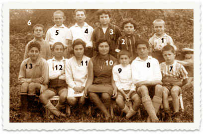 5. ילדי המושבה כנרת בשנת 1929: 1 - עמיחי הלוי, 2 - חנה כהן, 3 - שולמית כהן, 4 - עמנואל יזרעאלי, 5 - יואב הלוי, 6 - מתניה אברמסון, 7 - חזי יתום, 8 - יורם כבשנה, 9 - אליעזר שיינקר, 10 - ימינה יזרעאלי, 11 - נחמה חפץ, 12 - אבנר כבשנה, 13 - מרדכי רחמים.