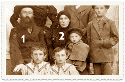12. צילום משנת 1898: 1 - יהודה שניידמן, 2 - אשתו לאה, וילדיהם (עומד מימין: אביגדור).