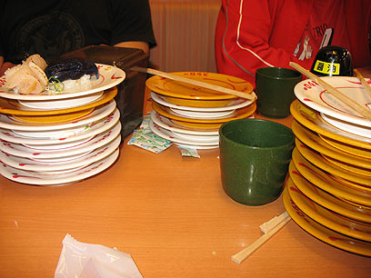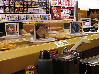 שימו לב שעד כה לא כתבתי ולו מילה אחת על סושי, והאמת היא שזה היה בכוונה – מסר שחשוב לי להעביר הוא שיפן היא בשום פנים ואופן לא רק סושי. למעשה, מסעדות סושי הן אלה שהכי פחות יוצא לי לבקר בהן. בגדול, אפשר לחלק אותן לאלו היקרות, בהן יושבים ליד שולחן וזוכים לשירות אדיב מהמלצר, ולמסעדות הקייטן-סושי (Kaiten-zushi) הזולות יותר, בהן נעות מנות סושי קטנות על גבי מסוע וכל סועד יכול להרים ולקחת את מה שהוא רוצה לאכול. בסוף הערב מחושב התשלום לפי מספר הצלחות שעל השולחן.