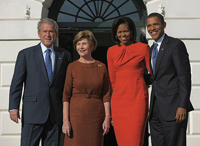 מפגש ראשון בין הנשיא היוצא והנשיא הנבחר: ברק אובאמה ורעייתו מישל הגיעו הערב לבית הלבן, והתקבלו על ידי בני הזוג בוש. בוש ואובאמה ניגשו ללשכה הסגלגלה כדי לדון בשורת נושאים בוערים - ואילו הרעיות סיירו בבית הלבן ודנו בגידול ילדים