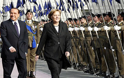 ברלוסקוני ומרקל סוקרים את משמר הכבוד, היום (צילום: רויטרס)
