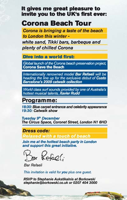 רפאלי, הייצוא המוצלח ביותר שלנו מאז חברות ההיי טק, מזמינה אתכם לחגוג איתה ב-9 בדצמבר בלונדון בליין המסיבות ולראות איך היא פותחת וסוגרת את תצוגת המסלול. במיוחד לשם כך, ייבנה חוף קריבי אמיתי בתוך היכלים סגורים בכל אחת מהערים, שיתנו לכם את תחושת החופש, השמש והים. כדי שלא תחשבו שאנחנו סתם מגזימים, היא אפילו שלחה הזמנה עם חתימתה האישית. המדור כבר אישר הגעה.