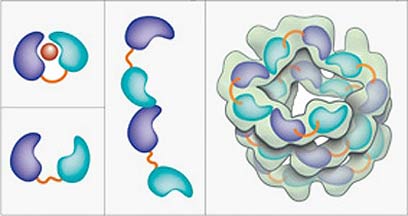 תיאור סכמטי המציג את הצורות השונות של החלבון VirE2. שתי ה"חביות" המרכיבות את החלבון נראות בתכלת ובסגול, והמקטע הגמיש המחבר אותן נראה בכתום. בנוכחות VirE1 (באדום, משמאל למעלה) ננעלים שני האזורים זה כנגד זה. ללא VirE1 (משמאל למטה) שני האזורים חופשיים לנוע, והחלבון יוצר שרשרות ארוכות (במרכז). בנוכחות די-אן-אי מתארגנות השרשרות בצורת סליל חלול (מימין) (איור: מכון ויצמן)