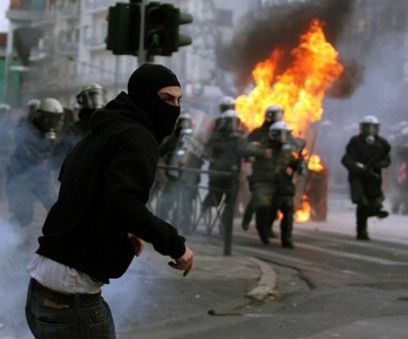 מפגין מתעמת עם שוטרים באתונה, היום (צילום: AFP)