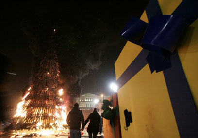 עץ חג המולד בלהבות בכיכר סינטגמה באתונה, הערב (צילום: רויטרס)