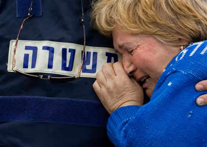תושבת שדרות מתנחמת בזרועות שוטר (צילום: AP)