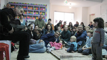 נכנסים פנימה. ברוזה מתארגן במהירות. אנשים מברכים לשלום. "טוב שבאת", הם אומרים. חלקם מתיישב על כסאות הילדים בגן, חלקם על הרצפה. העייפות מורגשת. גם פה לא נשארו רבים ומחצית הקיבוץ עזב. "מה שיהיה, יהיה. אנחנו עם דויד ברוזה כאן", אומרת חרל"פ לאלה שהגיעו, "אני יודעת שחלק גדול מכם נסע מכאן אבל מי שנשאר, ייהנה".