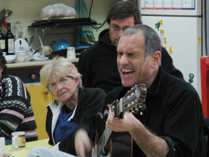 אנחנו תועים בדרך. מגיעים לקצה חבל שלום, כמעט עד לנקודת הגבול. "אם אתה מכניס אותנו פנימה, כדאי שגם תדע איך להוציא אותנו משם", משתעשע ברוזה עם יוסי הנהג, שממהר להוציא מפה. בכניסה לתלמי יוסף, אחרי חוות הקקטוסים שכבר מזמן לא ראתה מבקרים, מכוונים אותנו עד לרכב הביטחון. על פי מספר המכוניות שחונות במקום, ברור שלהופעה של ברוזה הגיעו גם מיישובי האזור. גם פה מתקיים המופע בגן הילדים, שעדיין מקושט בקישוטי חג החנוכה. "אלו המרחבים המוגנים היחידים בקיבוץ שיכולים להכיל מספר גדול יחסית של אנשים", אומרים לנו.