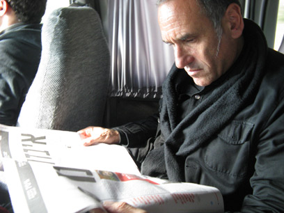 בטנדר שהעמידה לרשותו "אמנות לעם", הוא מוודא שהכל מסודר. "יש אפשרות לארגן עוד כרטיסים?", הוא מנסה ללחוץ בנייד על מנהלת הלהקה, שכבר סידרה עוד עשרות כרטיסי הזמנה נוספים גם להופעה בשבת מבלי שתתבקש. "יופי", הוא אומר כשהשיחה מתנתקת, "אפשר לזוז".