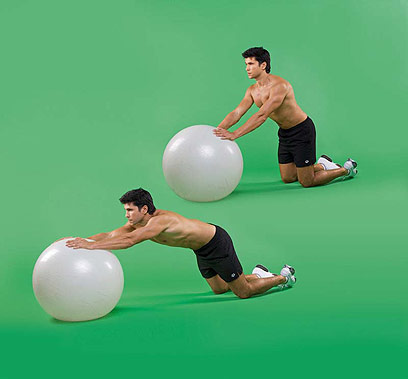 » עמוד על הברכיים כשהכדור לפניך וידיך מונחות על הכדור.