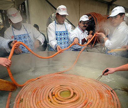 בקרואטיה עמלו בסוף השבוע להיכנס לספר השיאים של גינס עם הנקניקיה הארוכה בעולם - 532 מטרים מבשר חזיר.