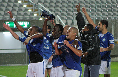 שחקני הפועל פ"ת חוגגים. למה הקהל לא מרוצה? (עוז מועלם)
