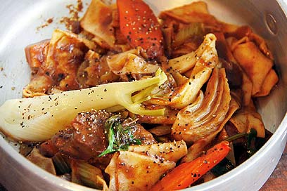 - מוסיפים את שאר הירקות ומשחימים אותם מעט. מוסיפים את נתחי הבשר והרוטב, ומבשלים כשתי דקות.