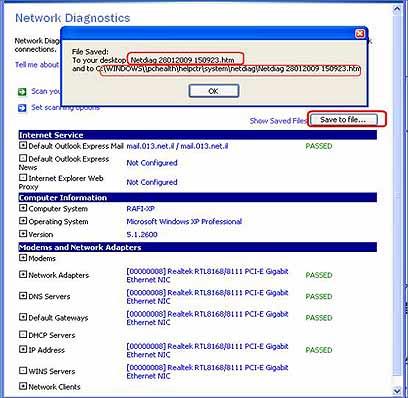 עם תום הבדיקה, תקבלו את מסך התוצאות שלהלן, ותוכלו לבצע "Save to File" . עותק מקובץ התוצאות ישמר בפורמט html בשם " NetDiag