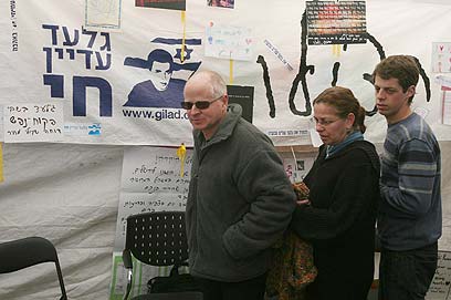בני משפחת שליט באוהל, ליד תמונת גלעד (צילום: גיל יוחנן)