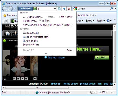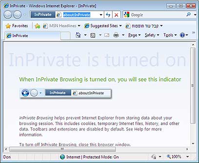במצב גלישה פרטית נפתח עותק נוסף של הדפדפן עם הלוגו הכחול Private בשורת הכתובת, אך הוא יצטיין בזיכרון לטווח קצר בלבד. ההיסטוריה, סיסמאות, עוגיות ומידע שהוקלד לא יישמרו ויושלמו אוטומטית לבאים אחריכם. שימושי לגלישה במחשבים ציבוריים כלשהם, אבל לא רק. הרגישים לענייני פרטיות ישמחו לגלות של- IE 8 יש כעת, בתפריט Safety (או בטיחות), אפשרות למחיקה מהירה של כל המידע המפליל הזה שכבר שמור במערכת, כמו אצל השועל.