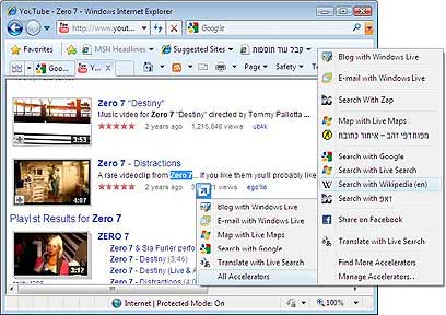 מאיצי הגלישה (accelerators) הם תוספים המאפשרים גישה מקוצרת לאתרים פופולריים - לא רק קיצורי דרך, אלא לינקים חכמים שמעבירים לאתר מידע לבקשת הגולש. כך, למשל, ניתן לסמן שם של אדם או בית עסק באתר כלשהו, ובלחיצה ימנית לבחור באפשרות של איתור מספר הטלפון בדפי זהב.