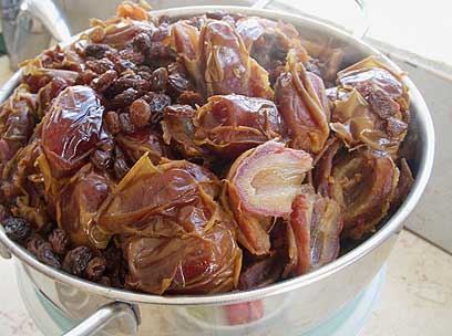- מניחים תמרים וצימוקים בסיר על אש גבוהה ומכסים במים.
