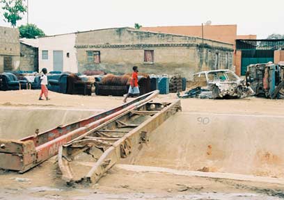 את הדוגמה הכי טובה לעניין הזה קיבלנו במחנות הפליטים. הזדמן לי פעם אחת לראות את המחנות האלה מהאוויר: הם מרוכזים ברדיוס ענק מסביב לעיר הבירה, מאופק עד אופק. שטיח עצום של בתי קובייה מבלוקים אפורים עם גגוני פח מגלוון, אלפי דונמים שמאכלסים מיליוני אנשים בתת-תנאים. הסמטאות כל כך צרות שבחלקן אפשר לעבור רק אם אתה ממש רזה, והן מלאות בזבל עד גובה הברכיים. הכביש הוא מצע זבל דרוס ושחור, הריח זוועתי, בוץ וביוב בכל פינה, ילדים שחורים מתפלשים בשלוליות חומות.