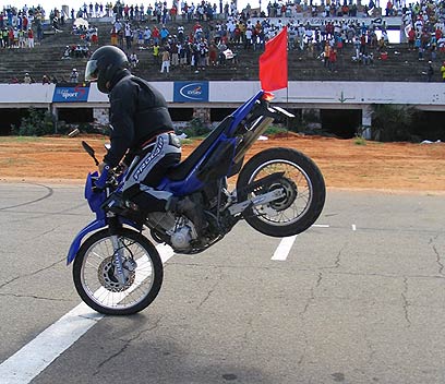 לפני מירוץ אופנועי הספורט התחילו להשתולל על הישורת כמה אופנועים אזרחיים שנסעו על גלגל אחד. מפקד היחידה ללוחמה בטרור דרש שהמדריכים מישראל יראו להם מאיפה משתין הדג, וככה מצאתי את עצמי דופק ווילי וסטופי על אופנוע משטרה מול 6,000 אנגולים מריעים.