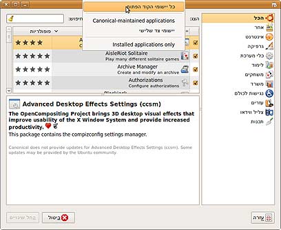 Compiz, (שאוחד עם Beryl), הוא מנהל החלונות התלת-ממדי שאחראי למראה הקופסה המסתובבת שאולי ראיתם בתמונות ובסרטוני הווידאו על לינוקס ב-YouTube. כדי להשיג את המראה השווה הזה, יש להתקין דרך "התקנה/הסרה". קודם כל נבחר בחלק העליון של החלון את האפשרות של "כל יישומי הקוד הפתוח". נחפש את המילה Compiz ונתקין את כל הקבצים שנמצאו ואת הדרישות הנוספות שלהם.