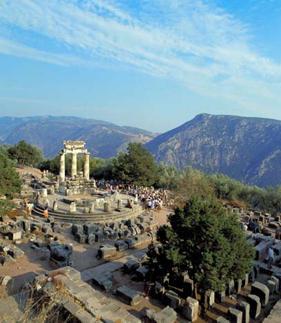 נעזוב את אווריטניה ואת הנוף הנהדר, חוזרים לכביש והפעם נוסעים מזרחה ללמיה. מלמיה פונים דרומה לכיוון אתונה, אולם אחרי כ-20 ק"מ אנו עוזבים שוב את הכביש הראשי ומטפסים דרומה לכיוון דלפי (Delphi). הפעם הדרך מטפסת על המדרונות של רכס הפרנסוס המפורסם. זהו "האררט" היווני בו נחתה תיבתו של נוח היווני, דיאוקליון, אחרי המבול שהנחית זאוס וחיסל את נתיניו בני האנוש. הנוף חוזר להיות הררי ומיוער, ובחלקים הגבוהים שוב נפגוש את עצי האשוח. בחורף ובאביב הכול כאן לבן כשלג. בהר פועל אתר הסקי המשוכלל והפופולרי ביותר ביוון.משיא הרכס אנו יורדים אל תצפית מדהימה על עמק מיליון הזיתים. אח"כ נרד עוד ובאמצע הגובה בין הרכס לבין המפרץ הקורינתי המבצבץ באופק, על "מרפסת" טופוגרפית ממנה נשקף נוף קדומים, נמצא האתר הארכיאולוגי של דלפי. זהו מקום מקדשו של אפולו והאוראקל (מגדת העתידות) של אפולו. למעלה מאלף שנה, עד הפיכת הנצרות לדת המדינה באימפריה הרומית, הייתה דלפי מרכזו הדתי, הפוליטי, החברתי והתקשורתי של העולם הפאן הלני, מוקד עלייה לרגל ומפגשים בכל הרמות. החפירות הארכיאולוגיות באתר, שפסק לפעול במאה החמישית לספירה, החלו בסוף המאה ה-19 ונמשכות עד היום - אך אומרים שעד כה נחשפו 20% בלבד ממה שקבור תחת האדמה...