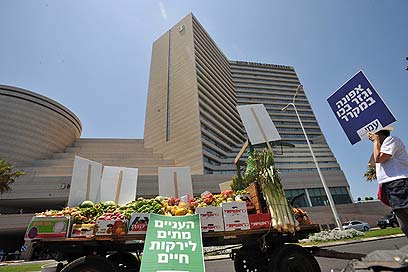 נלחמים נגד גזירות המע"מ. בזמן שבכירי המשק השתתפו בוועידה הכלכלית המרכזית של "כלכליסט" ופסגות, שהתקיימה היום (ג') במלון דייויד אינטרקונטיננטל בתל אביב, בחוץ התקיימה הפגנת מחאה נגד כוונת הממשלה לבטל את הפטור ממע"מ על פירות וירקות.