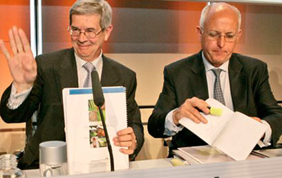 תיירי פיז'ו (מימין) ומנכ"ל PSA החדש, פיליפ וארין. מוכנים למיזוג עם פיאט? (צילום: AP)