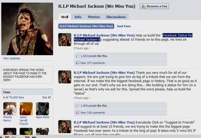 ברשת החברתית פייסבוק נפתחו מאז הלילה מספר קבוצות ודפי מעריצים לזכרו של ג'קסון עם הכיתוב R.I.P (נוח על משכבך בשלום, בתרגום חופשי). אחת מהקבוצות מבקשת להפיץ את הקישור על מנת לבנות את "פסל הפייסבוק" עבור ג'קסון. לכל קבוצה כזאת הצטרפו תוך שעות ספורות עשרות אלפי חברים.