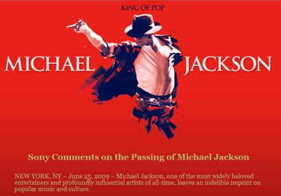 האתר של הזמר בכתובת michaeljackson.com מציג עמוד בודד ובו הודעה רשמית על מותו מטעם חברת סוני, ואינו מקשר ליצירות שלו או מביא קטעי ארכיון. ההודעה כוללת ביוגרפיה מקוצרת של ג'קסון ודברי הספד קצרים של בכירים בחברת סוני, המפיצה את המוזיקה שלו.