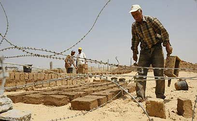 פועלים פלסטינים בונים בחימר. אין מלט או בטון (צילום ארכיון: AFP)