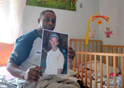 האב החורג מחזיק את תמונתו של אבי מקוריה, היום (צילום: אבי רוקח)