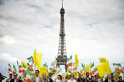 מפגינים נגד המשטר האיראני על רקע מגדל אייפל בפריז (צילום: AP)