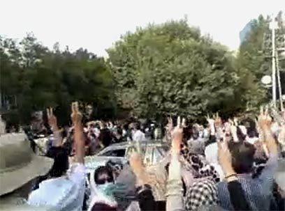 המפגינים האיראנים מסמנים וי באצבעותיהם, היום (מתוך סרטון יו-טיוב)