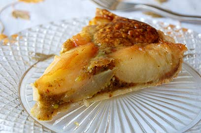 אני מאוד אוהבת אפרסקים - וגם אוהבת לרחרח אותם לפני רכישתם. משהו בריח שלהם מזכיר לי את ילדותי – וגם את חברת ילדותי שלא היתה נפרדת מגלעין של אפרסק לפני שהיתה מרוקנת אותו עד תום, לעתים בעזרת סיכת תפירה. עוגת האפרסקים שלפניכם אינה קלה כלל וכלל: להכנתה תזדקקו להכנת בצק פריך, קרם פיסטוקים, להשריית אפרסקים ביין לבן וסוכר- ובישולם. למרבה המזל, אין במתכון זה אפייה עיוורת והכל נאפה יחדיו. התוצאה? טארט משגע, שכיף לאכול בערבים קיציים, במיוחד לצד כדור גלידת וניל.