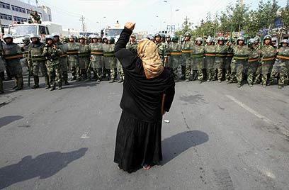אשה אויגורית מול חיילים סינים באורומצ'י (צילום ארכיון: רויטרס)
