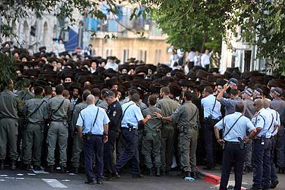 המפגינים החרדים מול כוחות המשטרה (צילום: גיל יוחנן)
