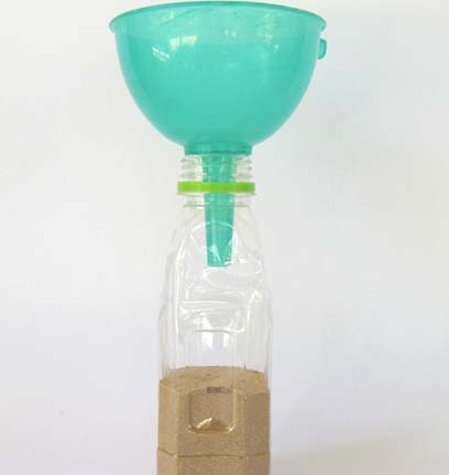 1. מניחים משפך מעל פיה של בקבוק פלסטיק קטן ושופכים 1/2-2/3 כוס מילוי. גודלו של הכדור נגזר מכמות המילוי. אנחנו יצרנו כדורי ג'אגלינג ממולאים בחול.