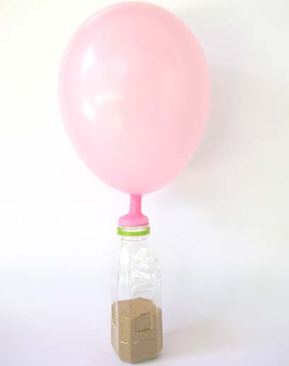 3. הופכים את הבקבוק ומניחים למילוי להיכנס לתוך הבלון. מנתקים את קצה הבלון מפיית הבקבוק וקושרים את צוואר הבלון קרוב לגוף הבלון.