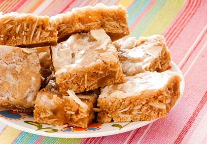 - כשהמאפה יוצא מן התנור מושחים את חלקו העליון בזיגוג, בעזרת מברשת. במידה והזיגוג קשה למריחה מוסיפים כפית מים ומערבבים. מניחים בצד לצינון במשך 10 דקות. כעבור 10 דקות מוציאים את המאפה בשלמותו מן התבנית בעזרת אחיזה בשולי נייר האפייה, מניחים על גבי קרש או משטח עבודה, חותכים בעזרת סכין לריבועים לפי הגודל הרצוי (36 גדולים או 60 קטנים) ומניחים לצינון מלא. מאחסנים בקופסת פלסטיק סגורה היטב עד למועד ההגשה.