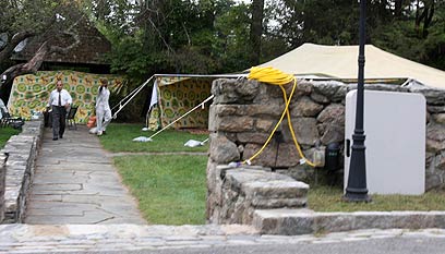 בשטח האחוזה נראה מהאוויר אוהל מזרח תיכוני וברור גם שהלובים הם ששכרו את האחוזה, אבל עדין לא ברור היכן קדאפי ישן. הוא ביקש למתוח אוהל על מגרש השייך ללובים בניו-ג'רזי ונדחה על-ידי המושל. הוא ביקש למתוח אוהל בסנטרל פארק, אך קיבל תשובה שלילית מעיריית ניו-יורק ולכן הרחיקו הלובים עד בדפורד.