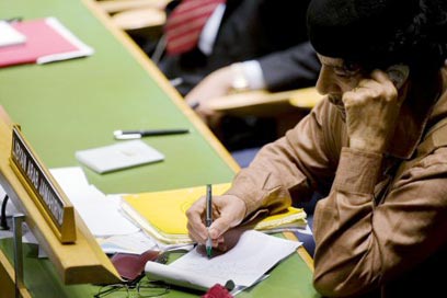 קדאפי בזמן הנאום. נשיא ארה"ב לא נשאר לשמוע אותו (צילום: AFP)