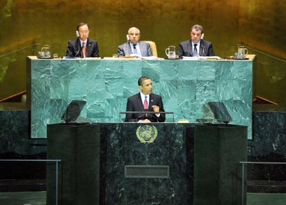 זה הזמן לשינוי עולמי, אך אמריקה לא תוכל לו לבדה - זה המסר העיקרי ששיגר נשיא ארצות הברית, ברק אובמה, בנאום דרמטי שנשא הערב (יום ד') בעצרת הכללית של האו"ם. הוא זכה למחיאות כפיים סוערות כאשר קרא להפסיק את הבנייה בהתנחלויות, ודיבר ארוכות על הצורך בשלום בין ישראל לשכנותיה: "אנחנו קוראים לפלסטינים להפסיק את ההסתה נגד ישראל ואנחנו ממשיכים להדגיש שארה"ב לא תקבל את הלגיטימיות של המשך ההתנחלויות של ישראל". הוא קרא לישראל לכבד את הזכויות הלגיטימיות של הפלסטינים.