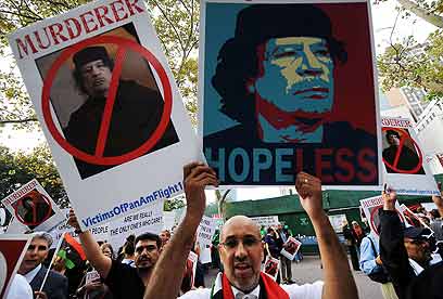המפגינים נגד קדאפי מחוץ לבניין האו"ם בניו-יורק (צילום: AFP)
