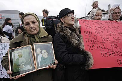 הפגנת בוסנים מחוץ לבית הדין בהאג (צילום: AP)