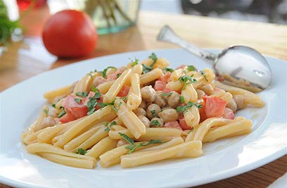 פסטה קצרה עם עגבניות שרי, זיתים, בזיליקום ושמן זית