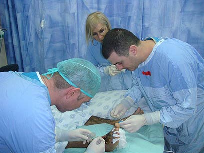 הרופאים מפזרים את הרימות על הרגל הפגועה