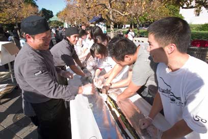 בעוד ישראל ולבנון מתקוטטות על שיאי החומוס, בארצות הברית מצאו מאכל אחר למקד את מאמציהם - והוא בכלל יפני. סטודנטים באוניברסיטת ברקלי שבמדינת קליפורניה נאספו אתמול (א') כדי לגלגל את רול הסושי הגדול בעולם, שאורכו 100 מטרים.