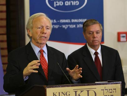 הסנאטורים לינדזי גרהאם וג'ו ליברמן בירושלים, אמש (צילום: AP)