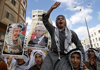 אבו עמאר לצד אבו מאזן בקרנבל שכם. מפגן תמיכה (צילום: AP)